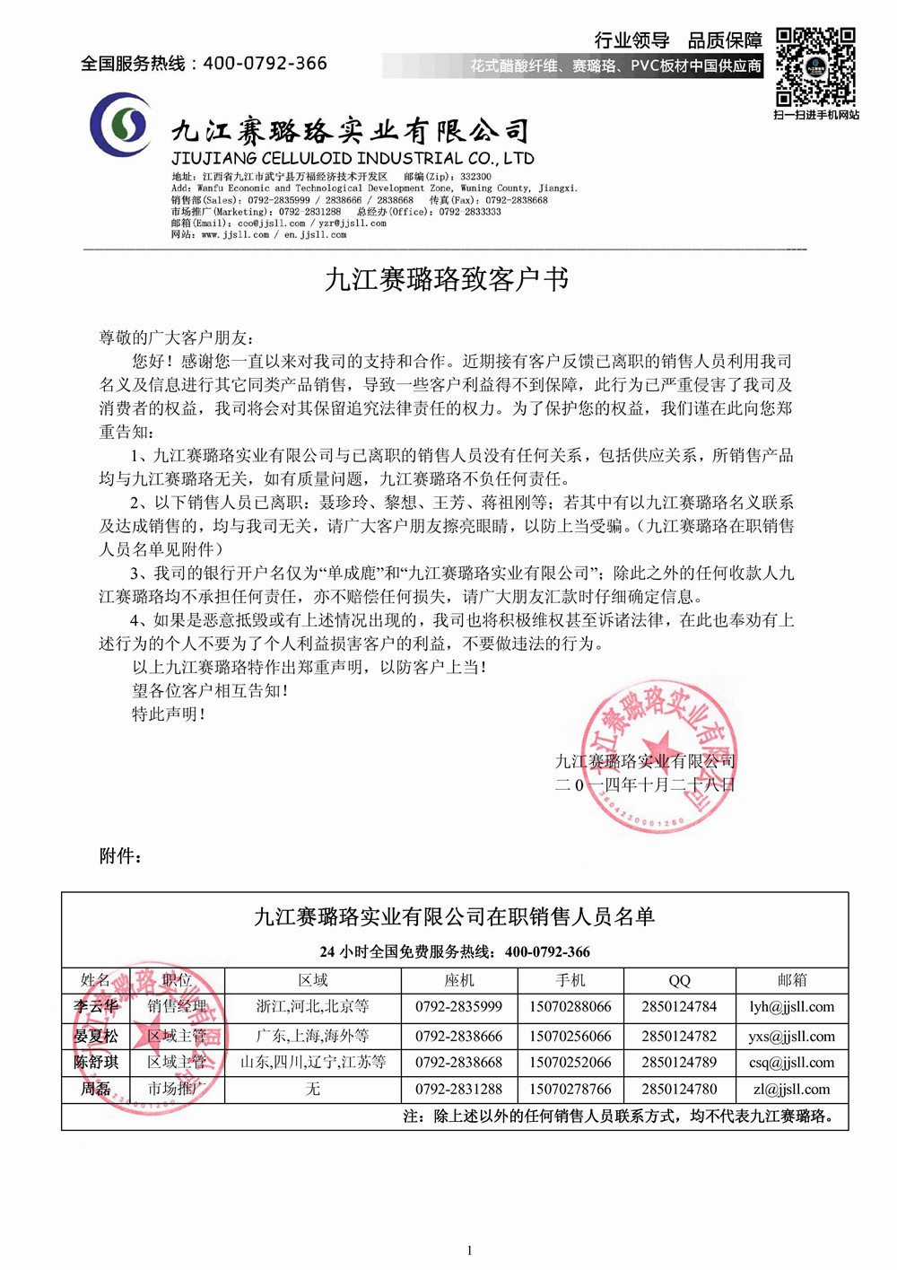 2、以下銷售人員已離職:聶珍玲、黎想、王芳、蔣祖剛等;若其中有以九江賽璐珞名義聯系及達成銷售的,均與我司無關,請廣大客戶朋友擦亮眼睛,以防上當受騙。(九江賽璐珞在職銷售人員名單見附件)