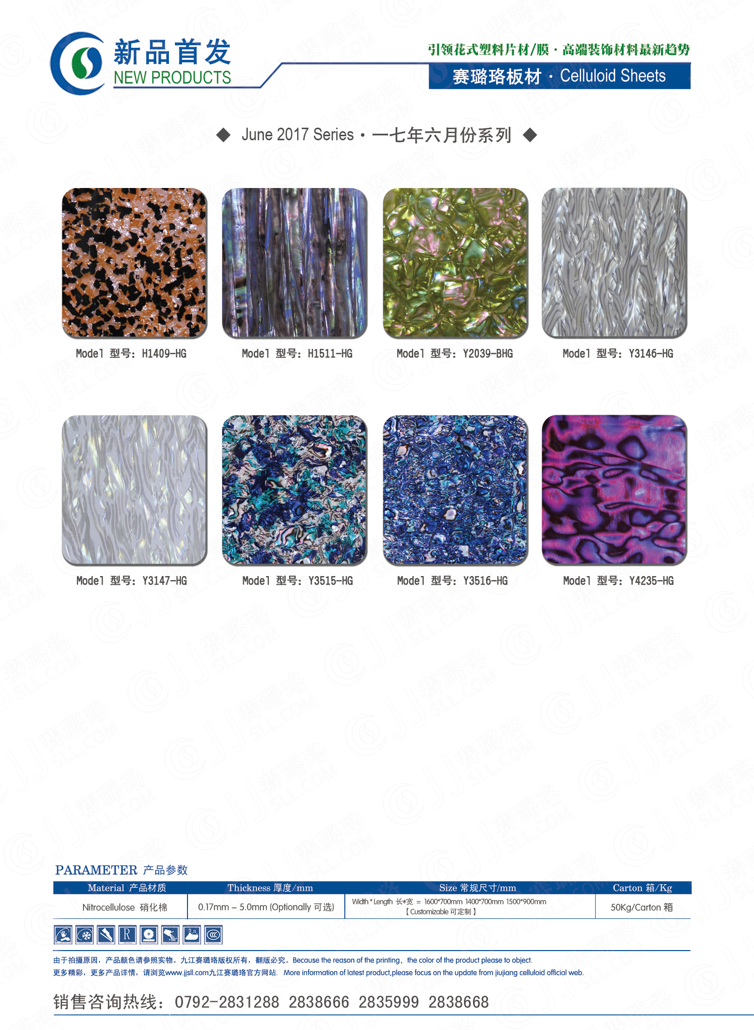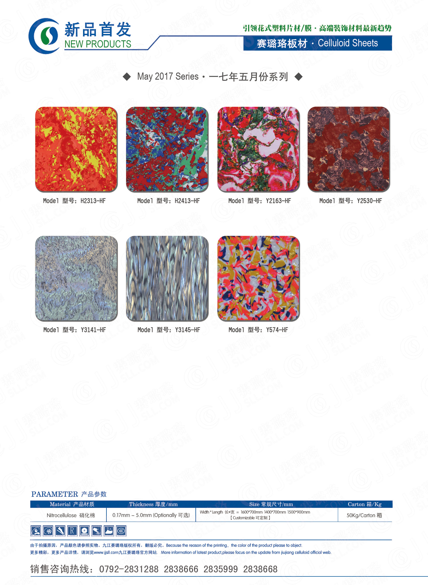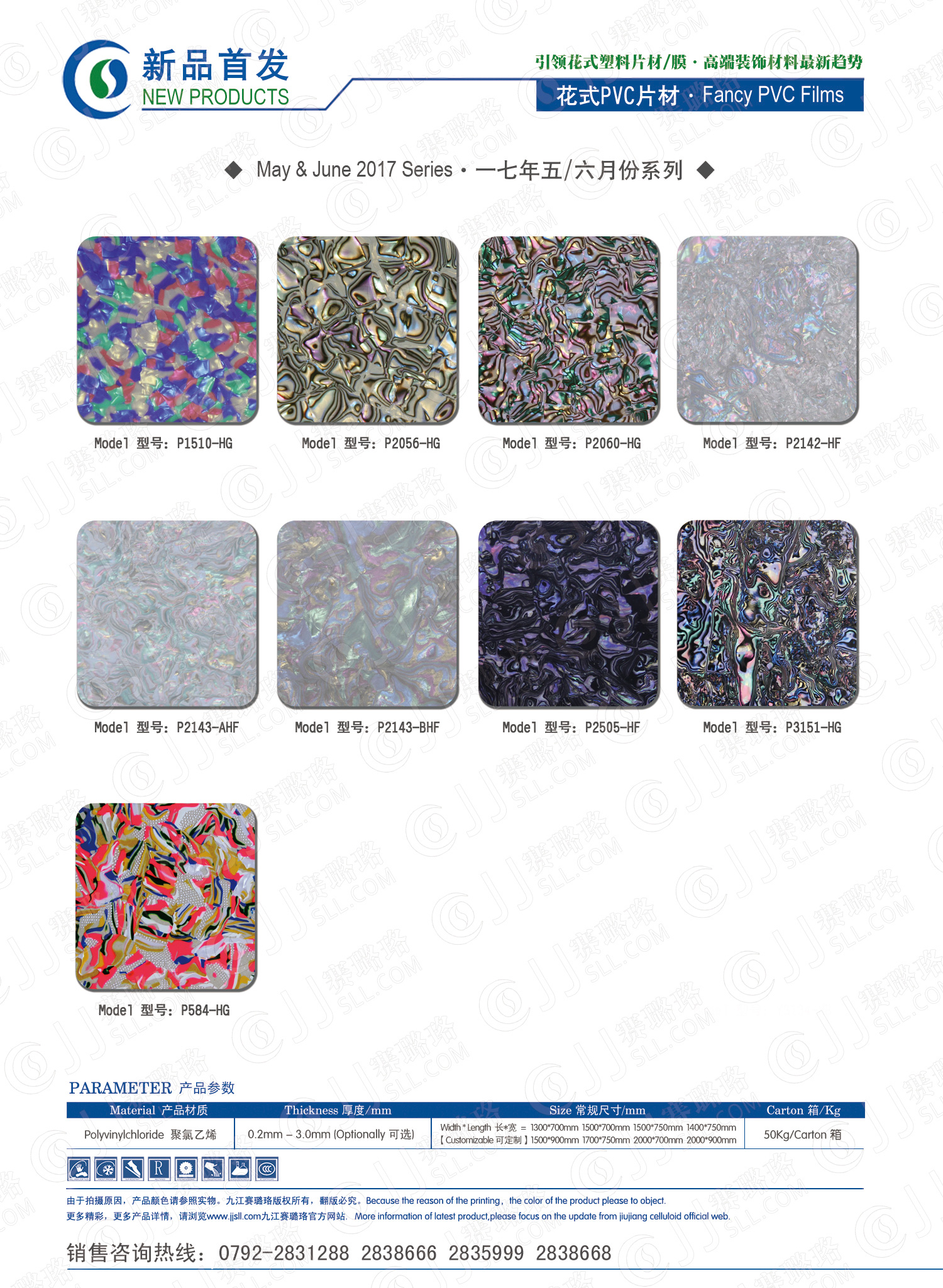 九江賽璐珞實業有限公司2017年五月及六月份賽璐珞板材、瑪瑙膜、理石膜、樂器裝飾材料、花式PVC片材新品發布,花式塑料片材/膜·多彩裝飾材料先驅者。咨詢熱線:0792-2838668 / 2831288 / 2838666 / 2835999。點擊圖片查看詳細產品
